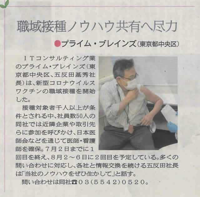 ハーモニーのお客様でもある、(株)プライム・ブレインズ様(東京都中央区)は、国の提唱でスタートしたワクチンの職域接種にいち早く手を挙げられました。http://www.primebrains.co.jp/