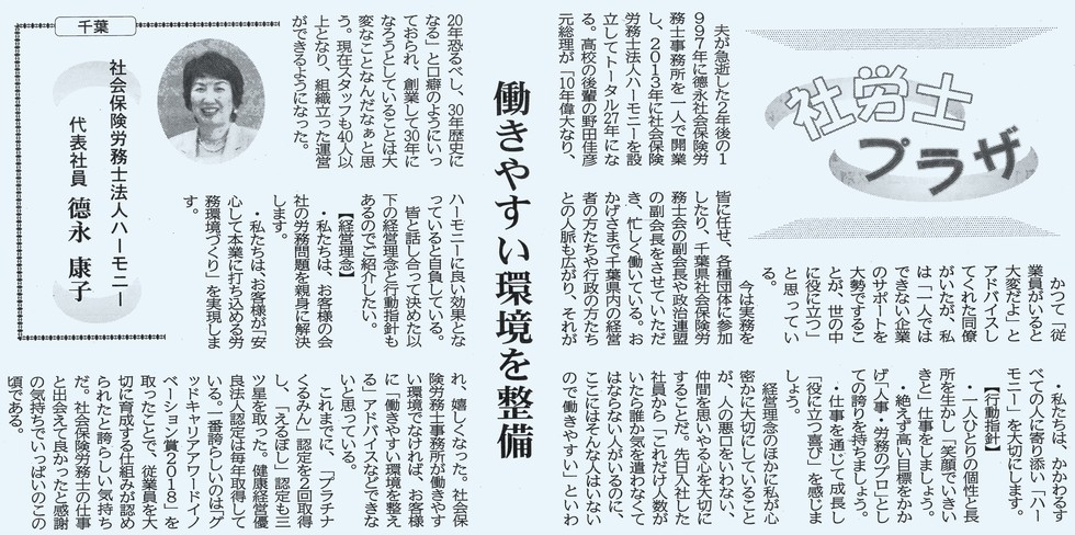 この度、会員企業訪問シリーズとしてハーモニーの現在の取り組みや弊社代表の德永が社会保険労務士を目指したきっかけを掲載していただきました。